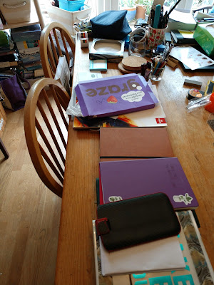 Looking at the photographs, I realised that the top two notebooks in the first picture don't get used much.. They tend to live at the bottom of the pile. The next one is a notebook swap - a sort of extended letter/musing/thoughts and ideas swap book with a friend that we have just started together, my green paper diary, the moth-patterned postcard embroidery swap book, a plastic covered book for jotting down current notes on a church group that zooms every week, a smaller commonplace book and another writing project.